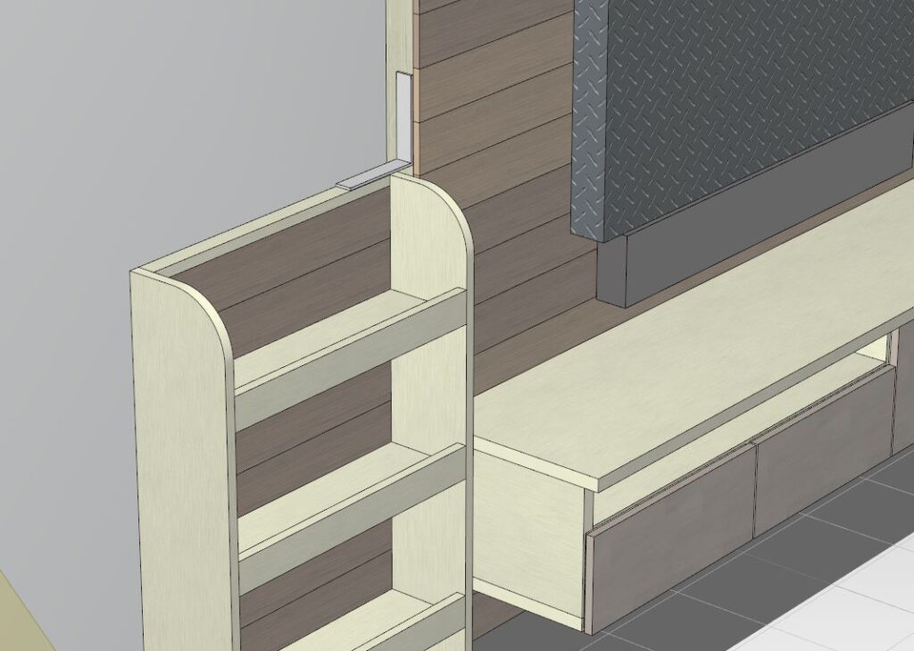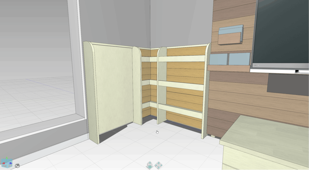 構成をL型にしてぬいぐるみの置き場所を追加したうえで、その左には小学校に入学した後にランドセルを置く場所が欲しかったので、フックを付けてカバンを掛けられるようにするスペースを追加。
