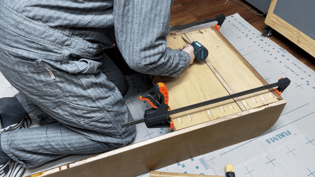 骨格はいつものラワンランバーコアt18をメインにポケットホールで段積みした構造。