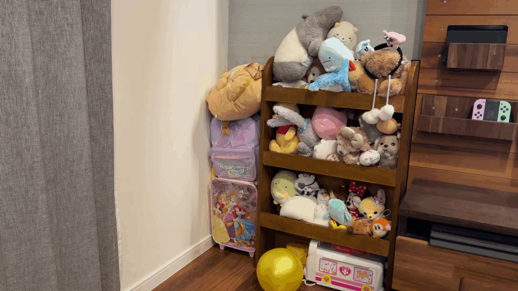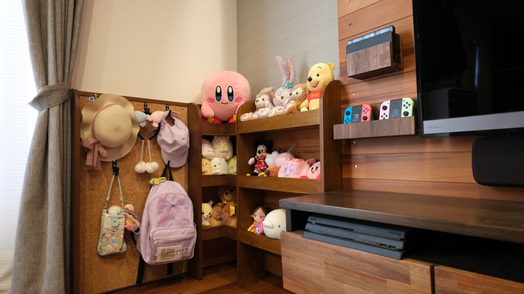 ぬいぐるみ以外にも行き場を失ったものが大量にあり、特に外に出かける際に自分の鞄を持つようになったので、カバンも掛けられるようにしないとダメですね。