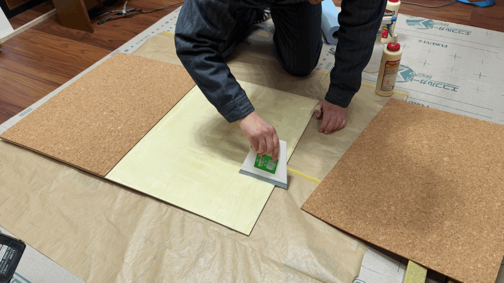 ので、厚さ5.5mm程度の薄ベニヤを買ってきて、それにボンドでコルクを貼り付けて(捨て貼り)