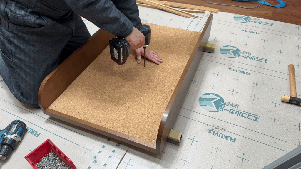 その他構造的にはいつもの合板の組み合わせでしかないのですが、ボンドはいつも通り殆ど仕様しておらず、解体廃棄時にばらせるように基本はビス止めになっています。