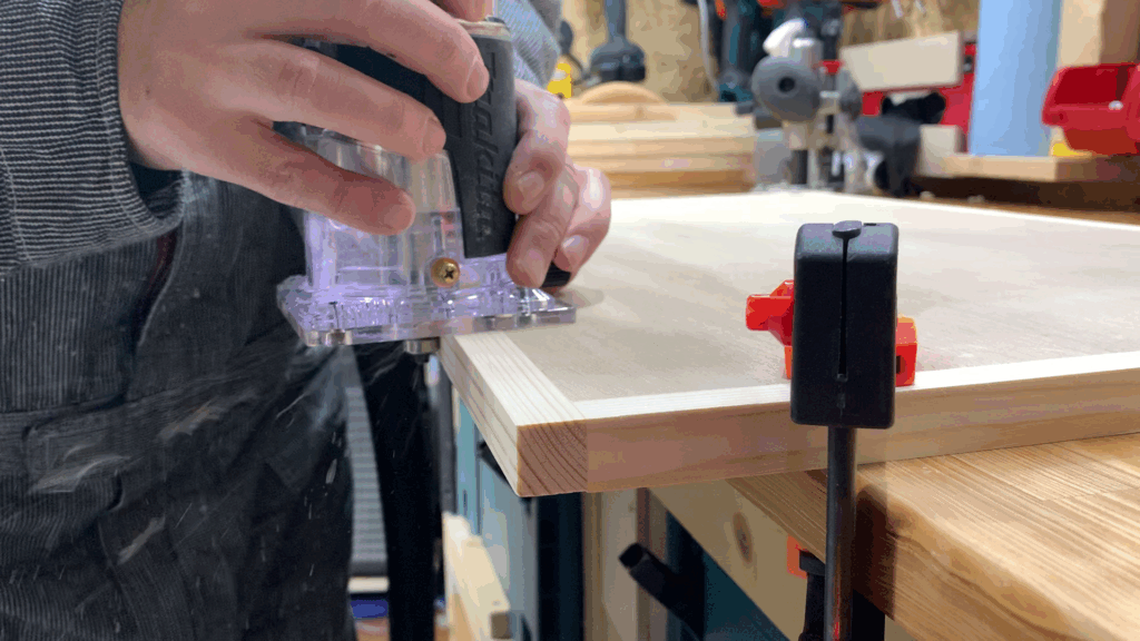 そこで、今回扉は四方をSPF(1'×4'材)の角材で囲うように接着し、そのSPFをトリマーで削って角を落とす作戦にしました。