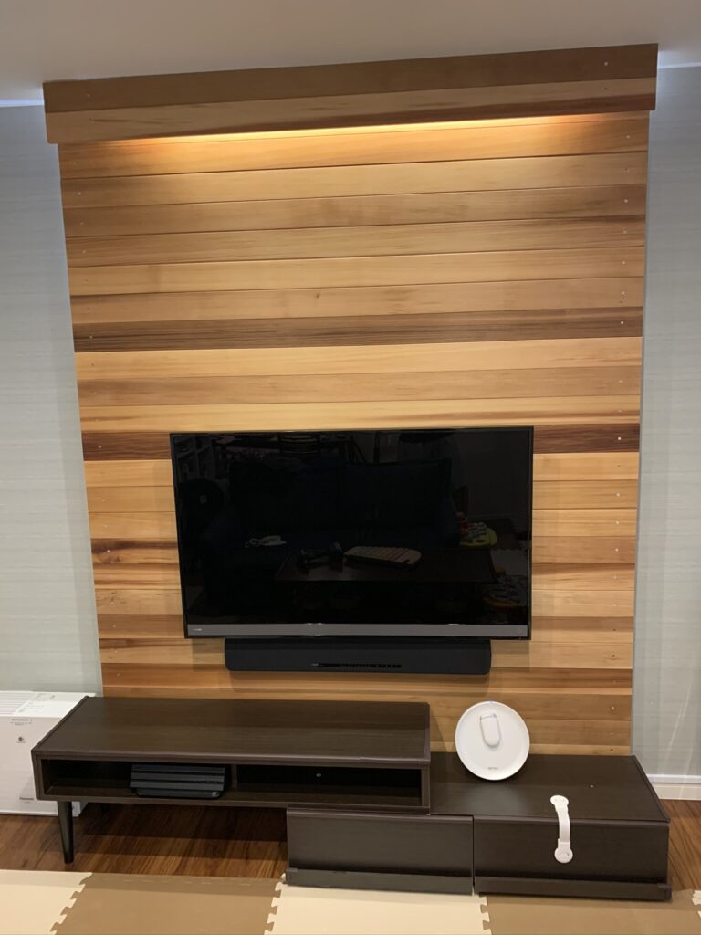 既存の杉板のテレビ壁との相性も良く、グッドマッチな感じです。何より、足元の掃除がしやすくて良い。