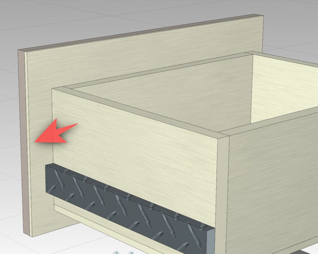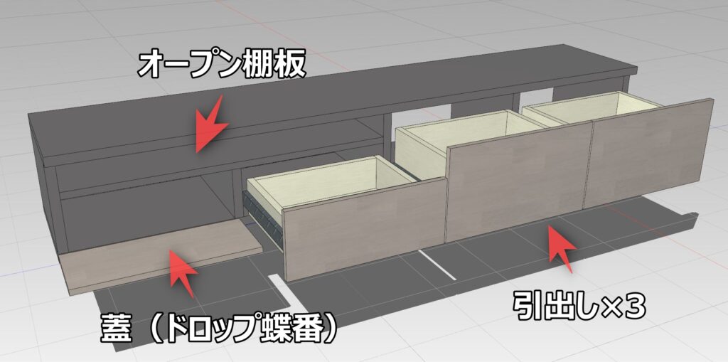 イメージしていたのですが、これを4つのブロックに分けて、うち3つを引き出しにすることにしました。