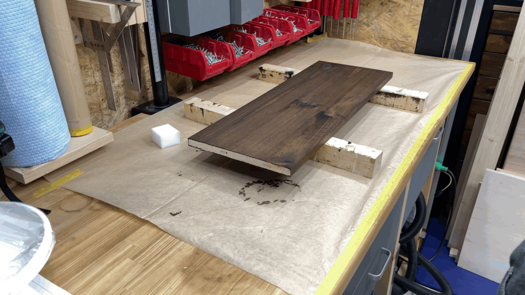 上の方で紹介したSPF+ワトコオイルの「きったねぇ」前板を何とかしたくて、でも作り直すのも大変だしダメ元で、ワトコオイル(ある程度サンダーで削る)の上からオイルステインを塗って、最後にブライワックスのジャコビアンを塗りこんでみました。