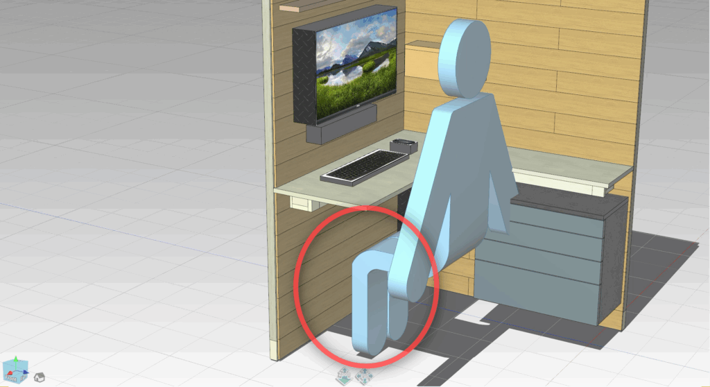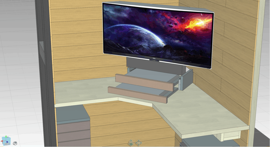 それで色々考えた結果、下記のようにL型の頂点に向かって座り、モニターはコーナー部に下地を作って壁掛け金具を